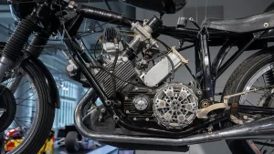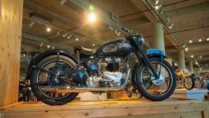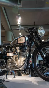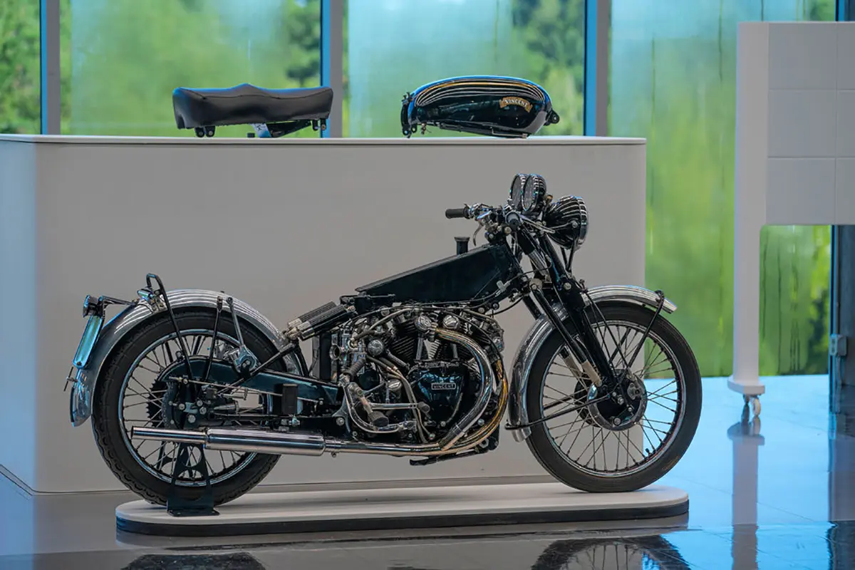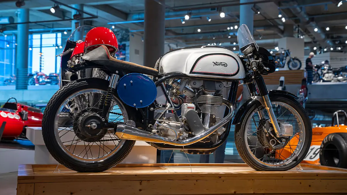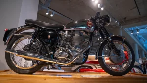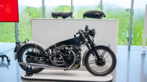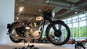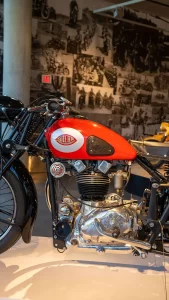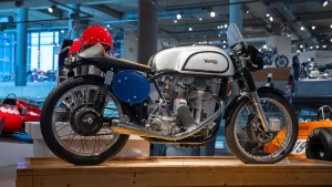 If you arrive in Birmingham thinking that the museum is just about some rich guy showing off the size of his wealth you’re in for a surprise. As soon as you drive up the curving 1.5-mile tree-lined entrance road you realize that this is something amazing. With its perfectly manicured grass and privately commissioned sculptures, there is little doubt that George Barber is more about perfection than sheer size. If there are any lingering doubts, one step inside the cavernous building reveals a scene of absolute beauty. Everywhere you turn, there are motorcycles. On the ground, on raised boxes, hanging from the ceiling, even stacked one above the other all the way to the ceiling. At any one time, there are approximately one thousand motorcycles basking in the warm glow of the spotlights. At the same time, a further one thousand are hidden away in storage, awaiting their turn for glory on the display floor.