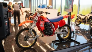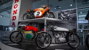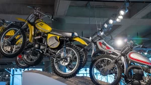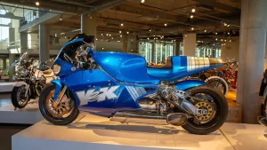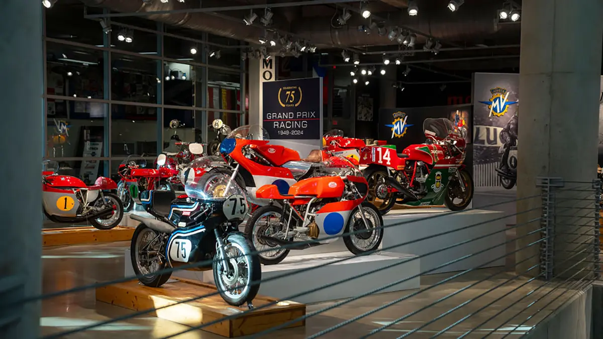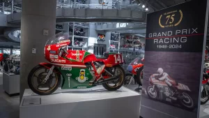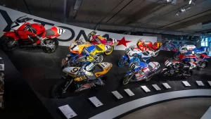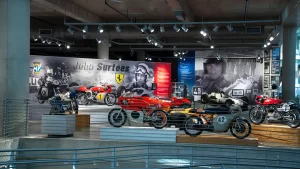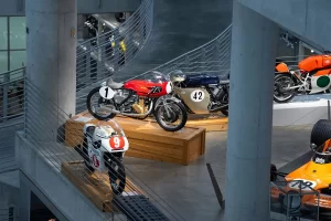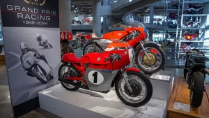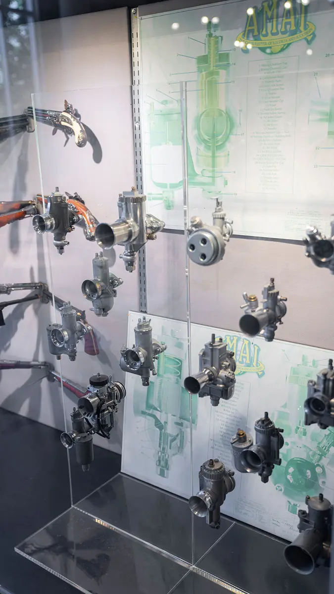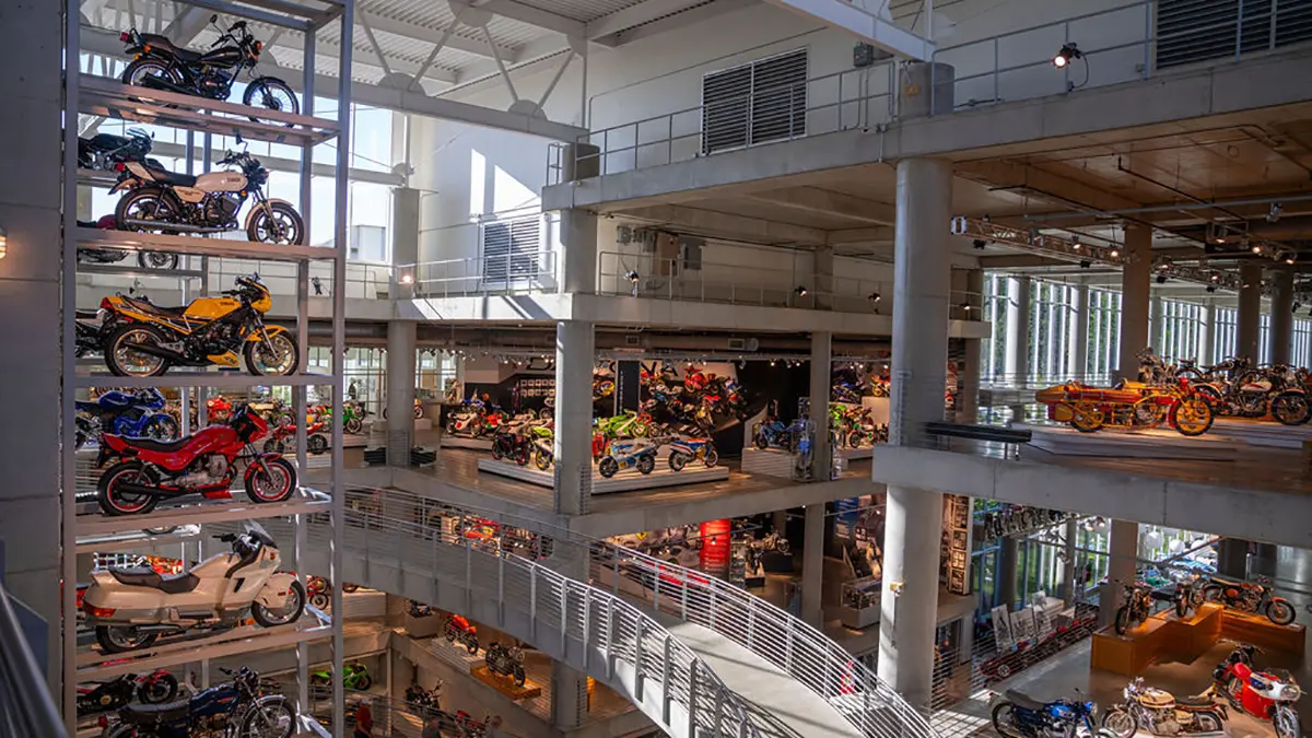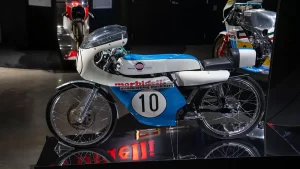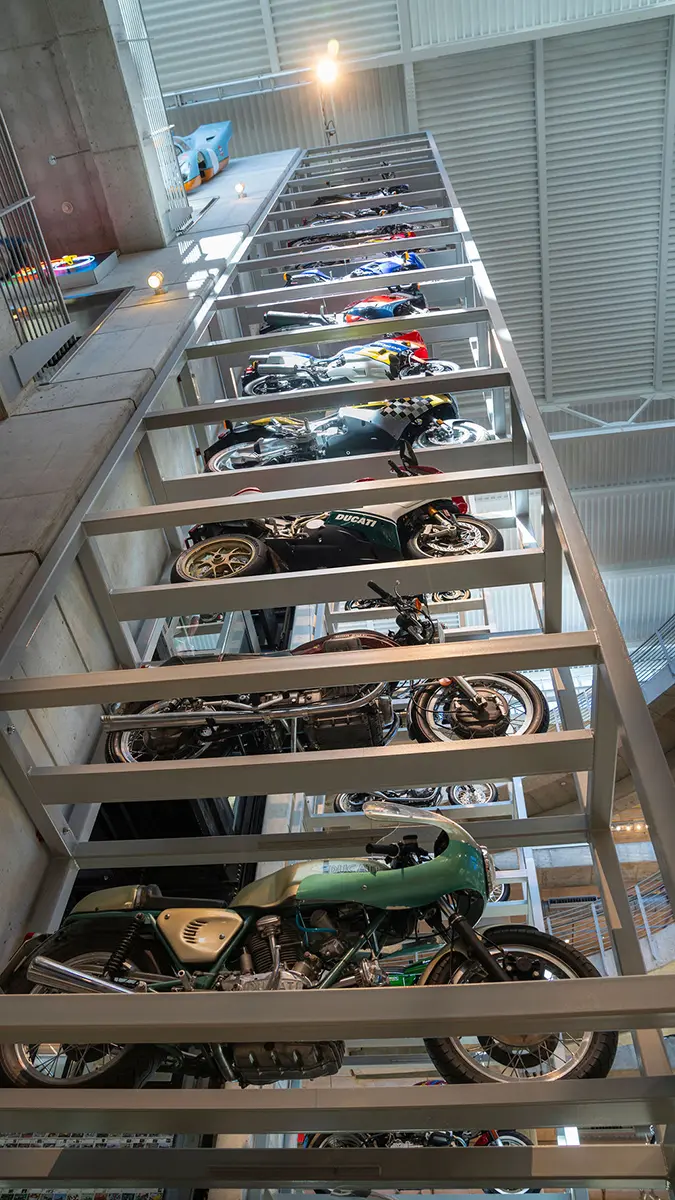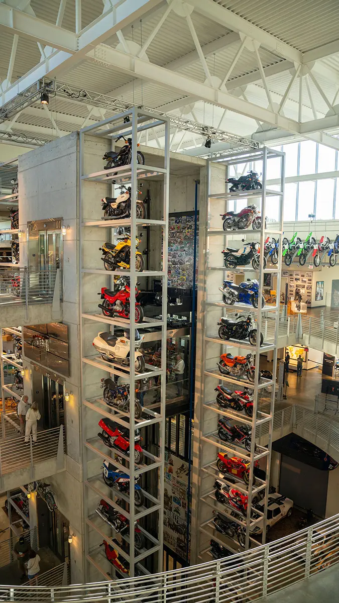 There are five floors and two interconnected buildings to choose from, so figuring where to start can be a problem. Just to the left of the entrance is an area dedicated to roadracing. Here some of the most famous MV Agustas sit next to Mike Hailwood’s I.O.M. Ducati and Dick Mann’s Daytona Honda Four. Behind them are G.P. two-strokes, big and small, and a cutaway from Honda’s mighty NR500. If oval pistons do not excite you, maybe a few famous Superbikes will pique some interest.