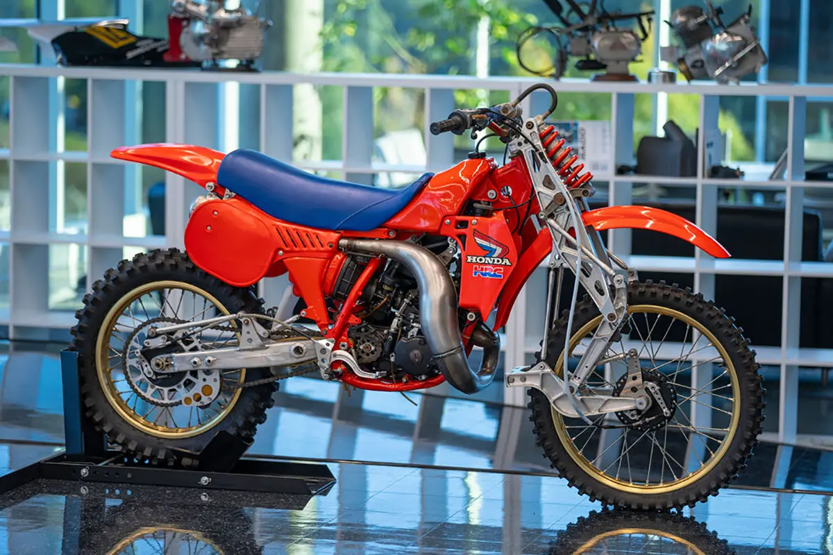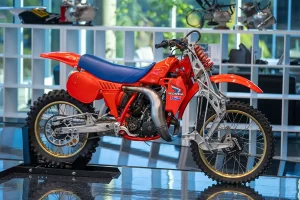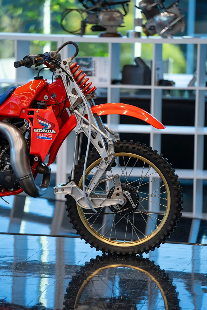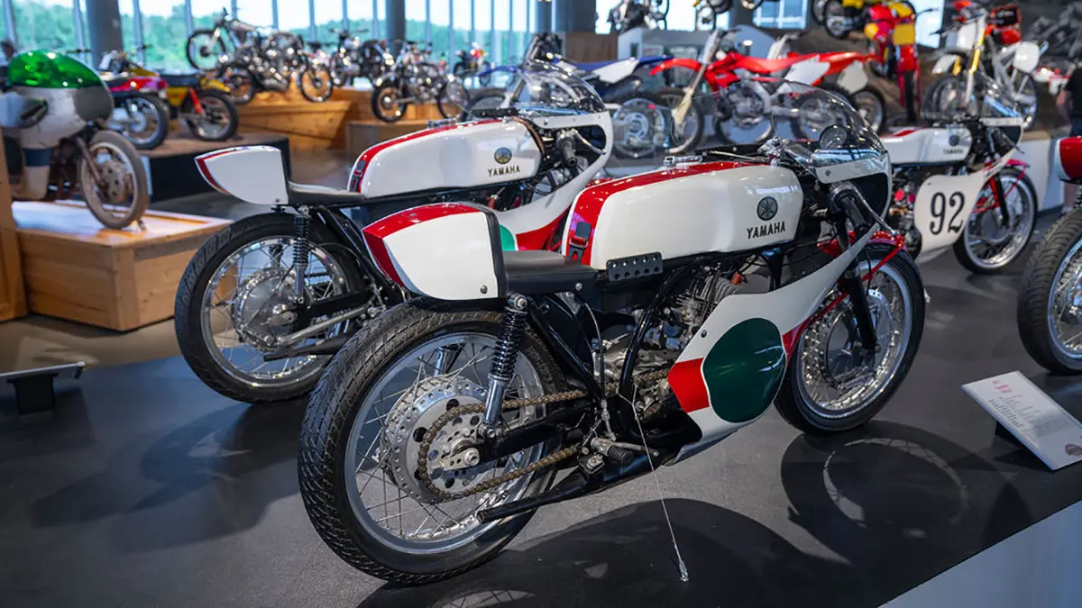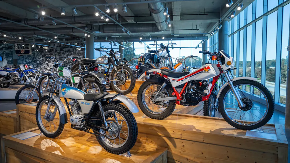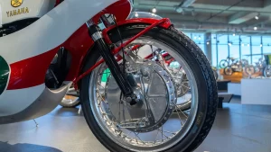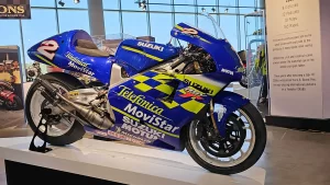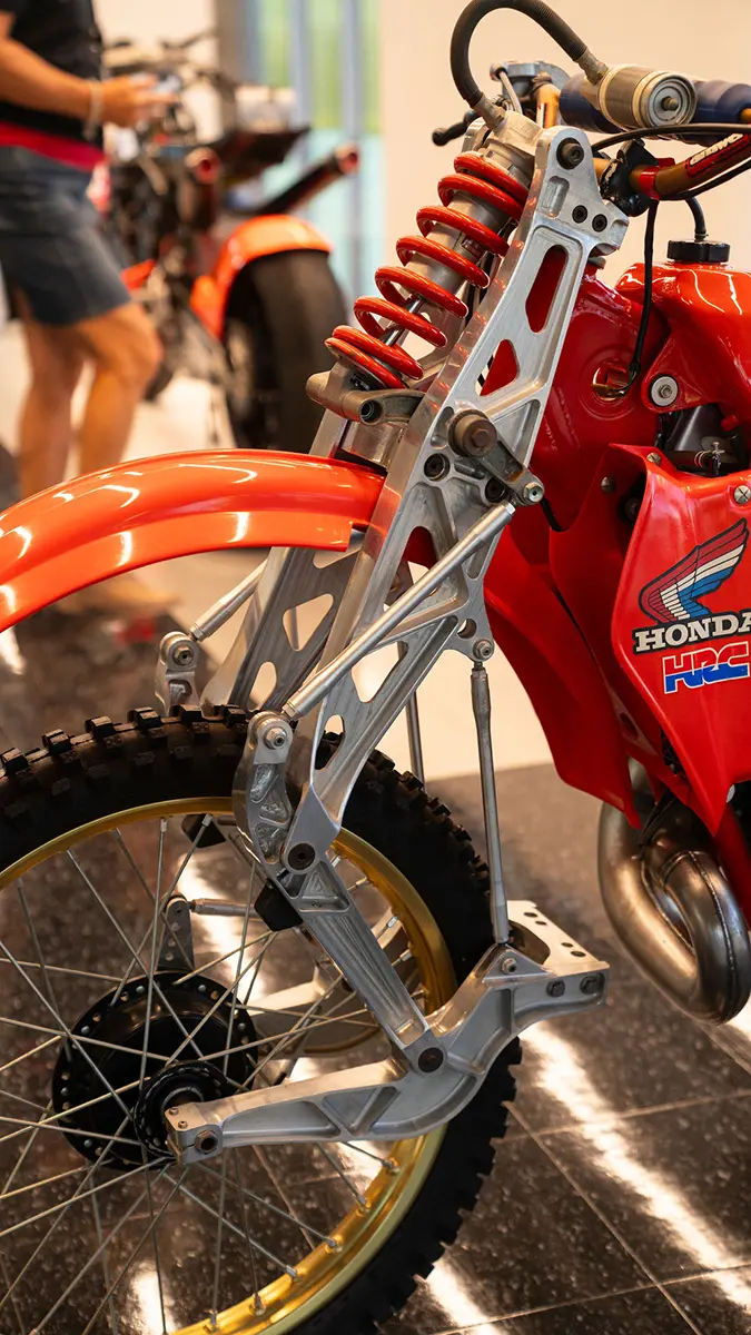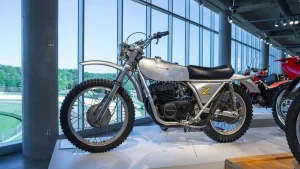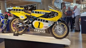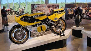 There are five floors and two interconnected buildings to choose from, so figuring where to start can be a problem. Just to the left of the entrance is an area dedicated to roadracing. Here some of the most famous MV Agustas sit next to Mike Hailwood’s I.O.M. Ducati and Dick Mann’s Daytona Honda Four. Behind them are G.P. two-strokes, big and small, and a cutaway from Honda’s mighty NR500. If oval pistons do not excite you, maybe a few famous Superbikes will pique some interest.